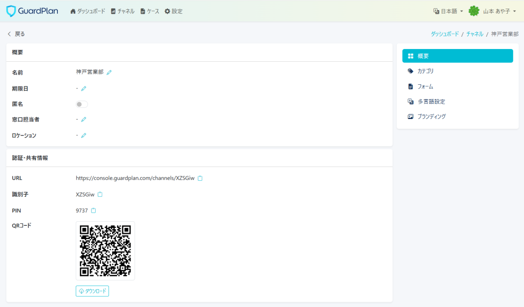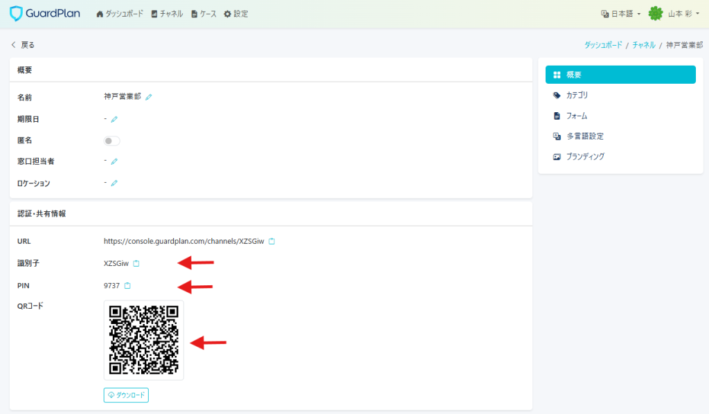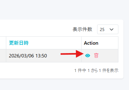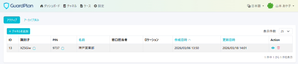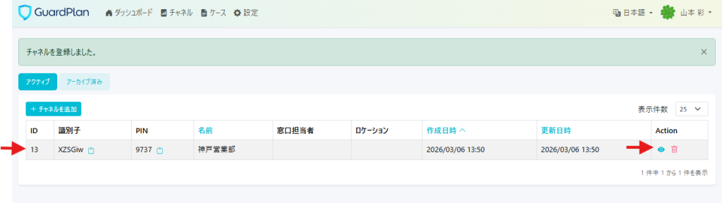 登録したチャネルの確認ができましたら、【Action】から詳細を確認してください。(こちらには識別子とPINナンバーが表記されます。)